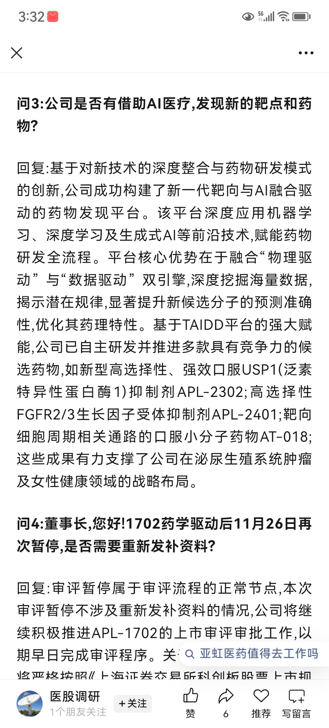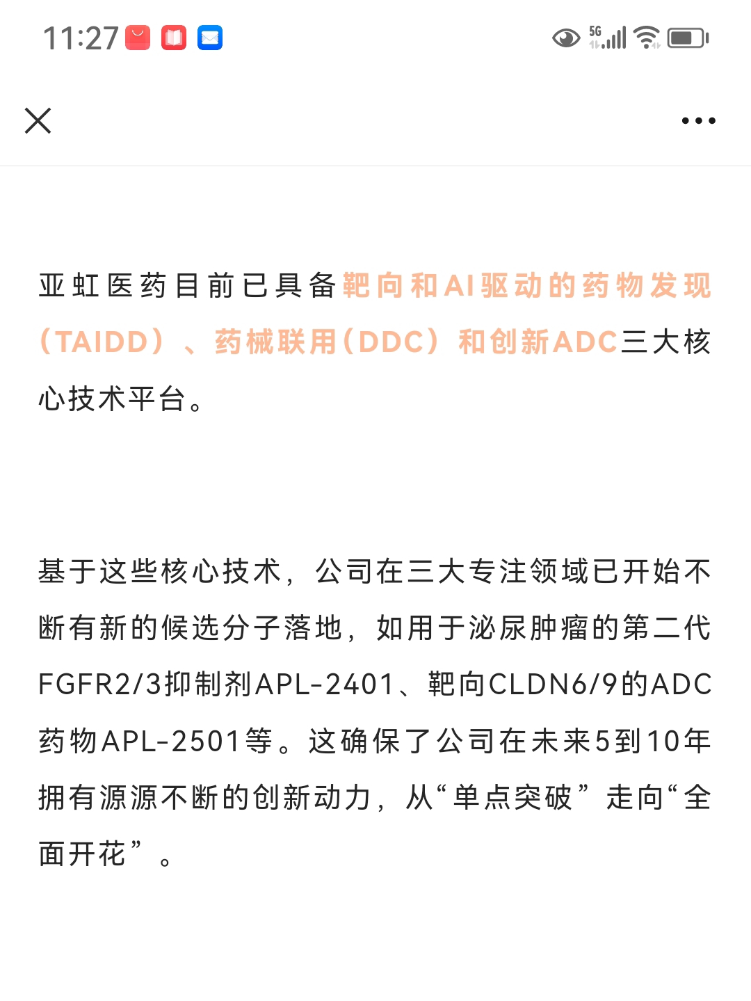 $亚虹医药-U(SH688176)$ 亚虹医药是国内少有真正具有AI+制药平台创新药企业,且AI平台已开发两项具有重磅药物潜质的重大成果APL2401与APL2501已经在临床试验阶段!!!