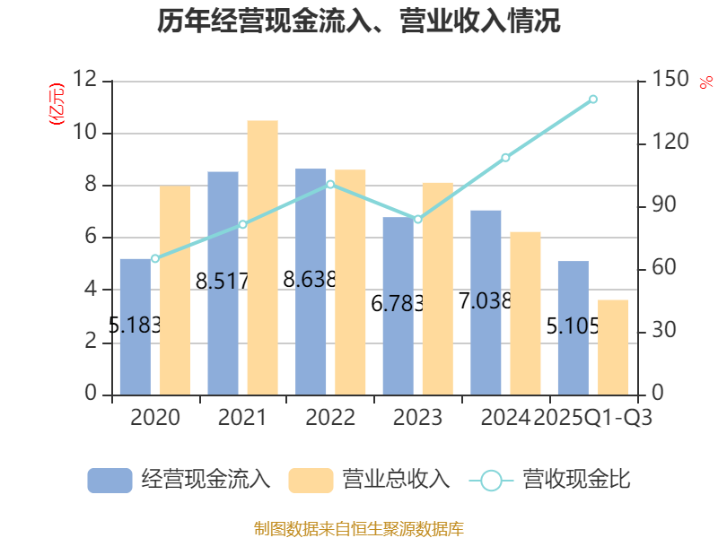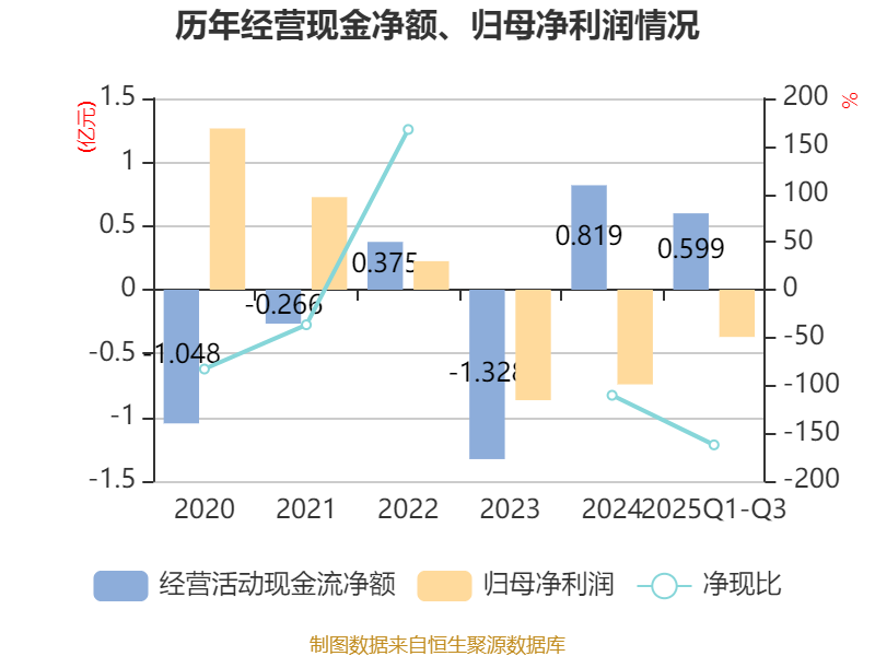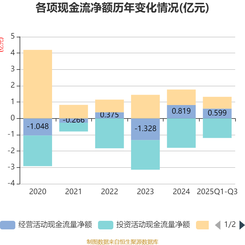 2025年前三季度,公司经营活动现金流净额为5992.07万元,同比增长89.1%;筹资活动现金流净额7229.59万元,同比减少2333.63万元;投资活动现金流净额-1.2亿元,上年同期为-1.72亿元。