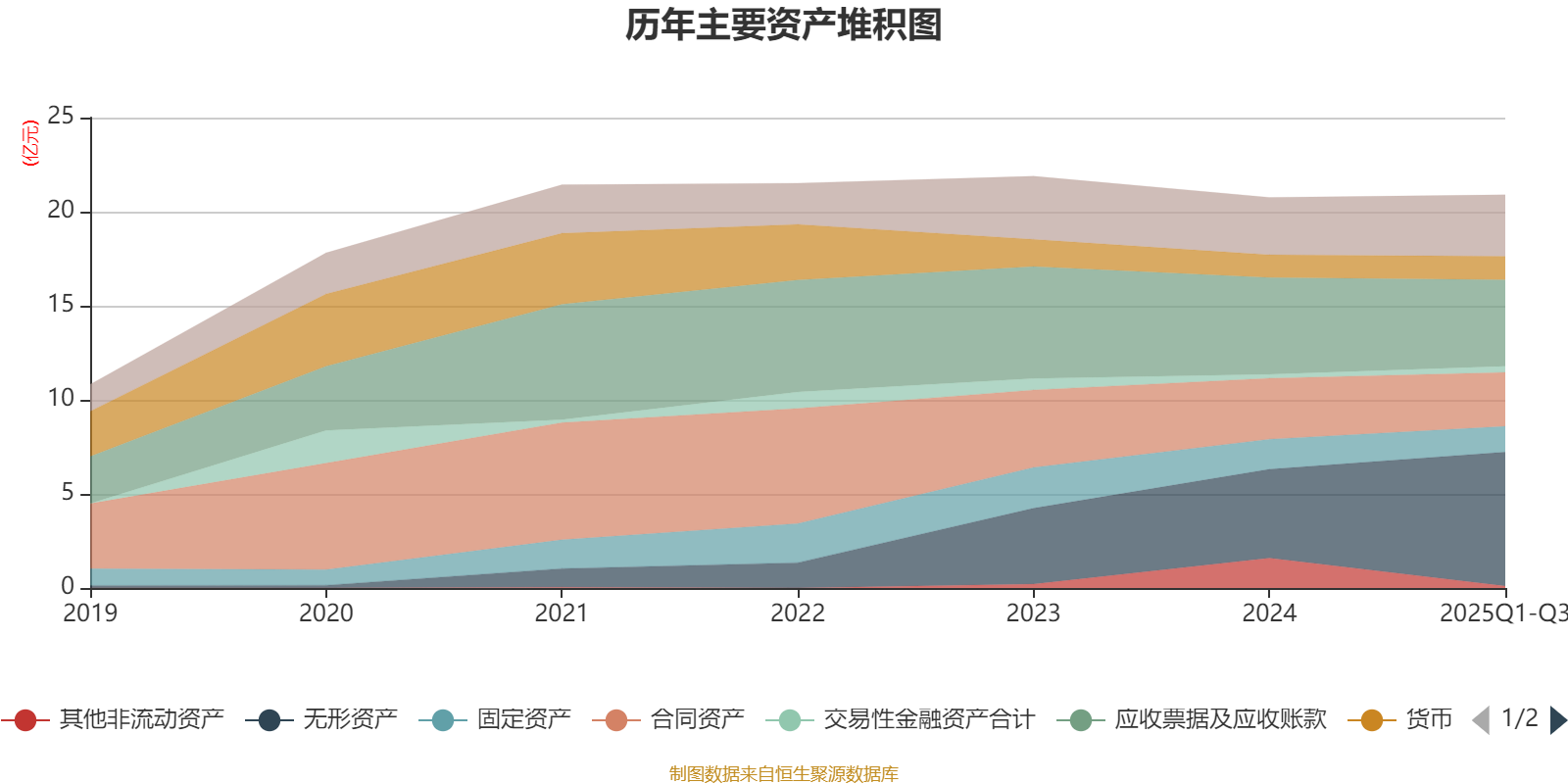 资产重大变化方面,截至2025年三季度末,公司无形资产较上年末增加50.9%,占公司总资产比重上升11.35个百分点;其他非流动资产较上年末减少93.38%,占公司总资产比重下降7.17个百分点;应收票据及应收账款较上年末减少10.77%,占公司总资产比重下降2.81个百分点;合同资产较上年末减少11.34%,占公司总资产比重下降1.86个百分点。