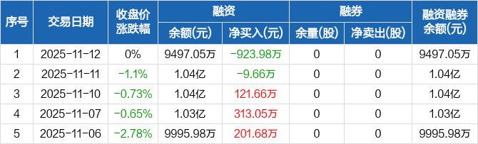 万德斯:融资净偿还923.98万元,融资余额9497.05万元(11-12)