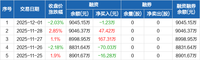 万德斯:融资净偿还1.23万元,融资余额9045.15万元(12-01)