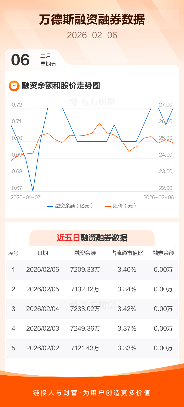 交易所最新数据显示,万德斯于2026年2月6日获融资买入206.77万元,融资偿还129.56万元,当日融资净买入77.21万元。目前,该股融资余额7209.33万,占流通市值比例为3.40%。