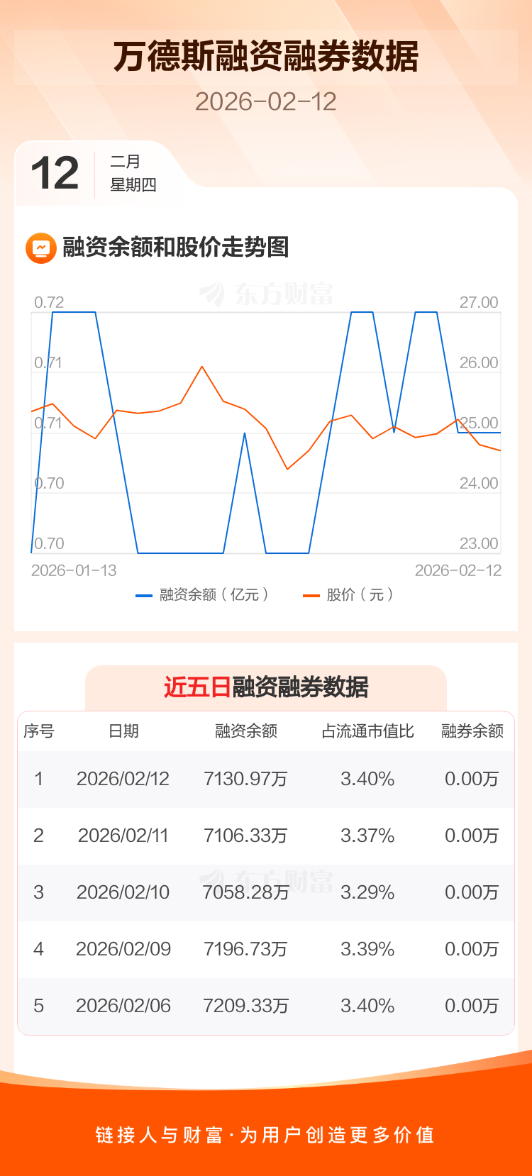 交易所最新数据显示,万德斯于2026年2月12日获融资买入172.33万元,融资偿还147.69万元,当日融资净买入24.64万元。目前,该股融资余额7130.97万,占流通市值比例为3.40%。