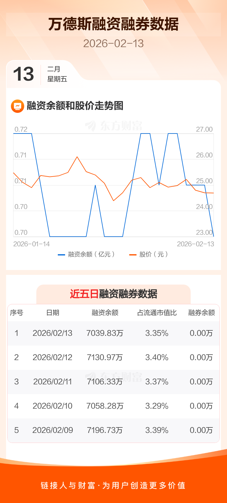 交易所最新数据显示,万德斯于2026年2月13日获融资买入172.93万元,融资偿还264.07万元,当日融资净偿还91.14万元。目前,该股融资余额7039.83万,占流通市值比例为3.35%。
