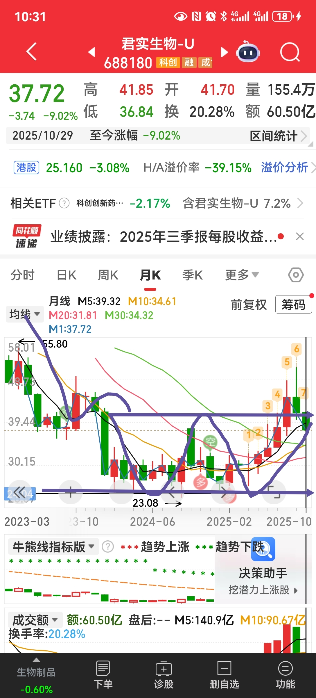 $君实生物-U(SH688180)$ 月线来看,跌回23元附近才是安全边界。目前散户都是套牢的,都不原意割肉,主力也没有进场,所以只会无限的往下赶底。只有散户撑不住了他们才能收到筹码。
