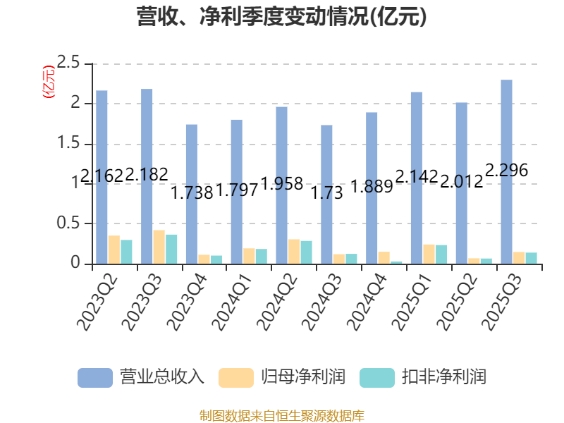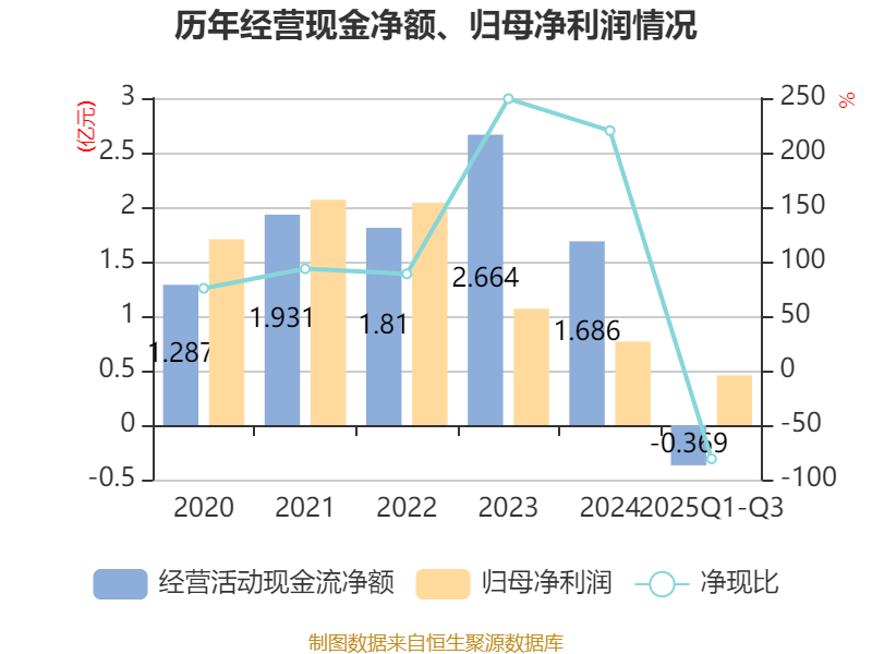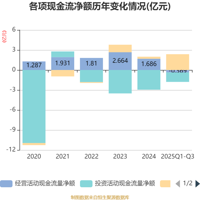 2025年前三季度,公司经营活动现金流净额为-3685.63万元,同比减少1.27亿元;筹资活动现金流净额2.37亿元,同比增加2.14亿元;投资活动现金流净额-1.42亿元,上年同期为-1.94亿元。
