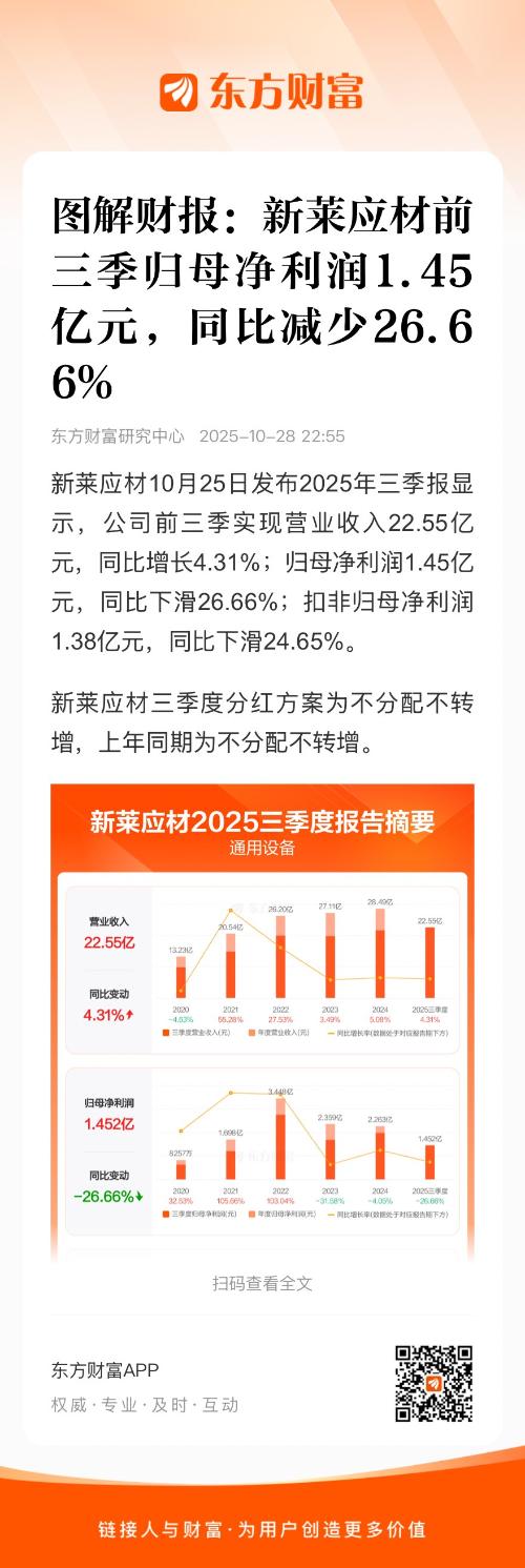 新莱应材10月25日发布2025年三季报显示,公司前三季实现营业收入22.55亿元,同比增长4.31%;归母净利润1.45亿元,同比下滑26.66%;扣非归母净利润1.38亿元,同比下滑24.65%。
