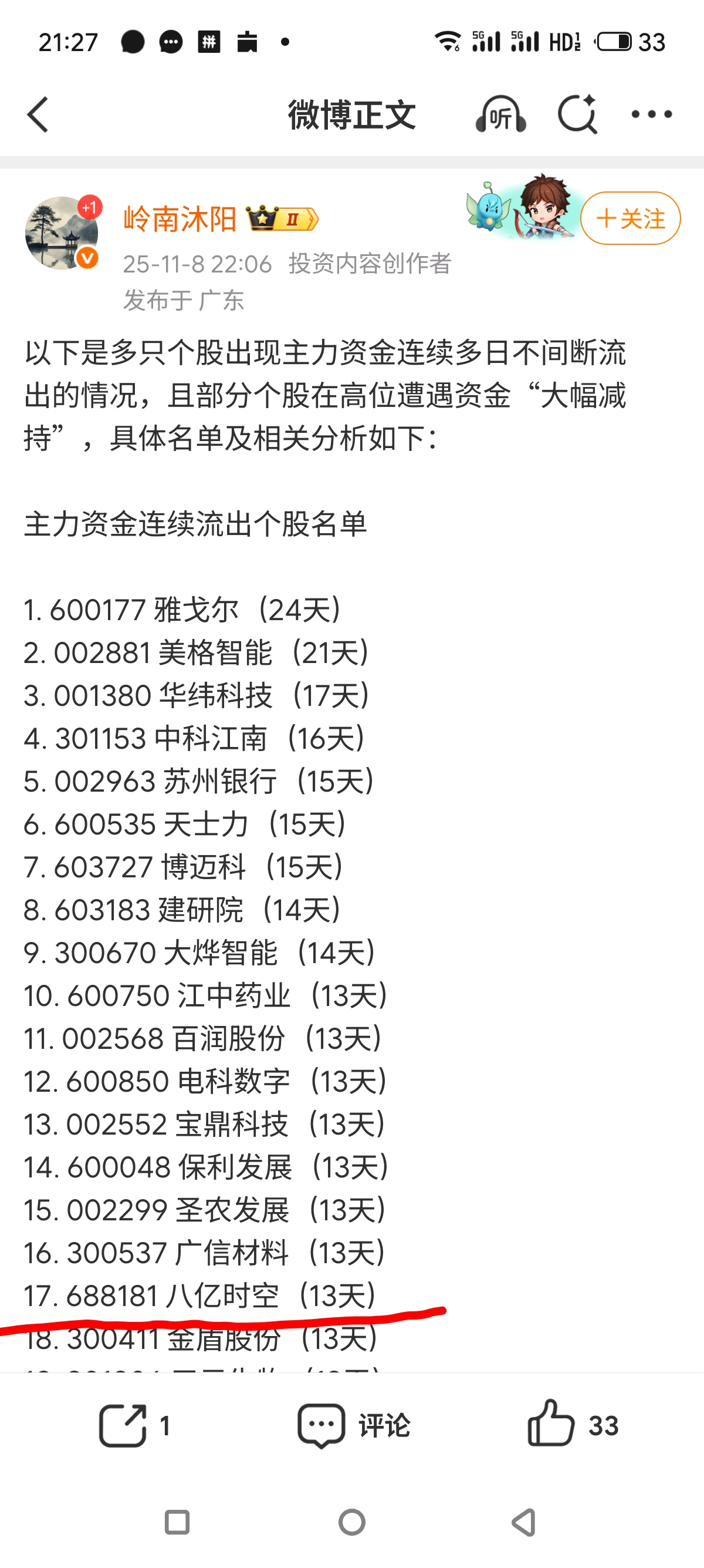 $八亿时空(SH688181)$ 13天时间,主力基本走了74%-83%