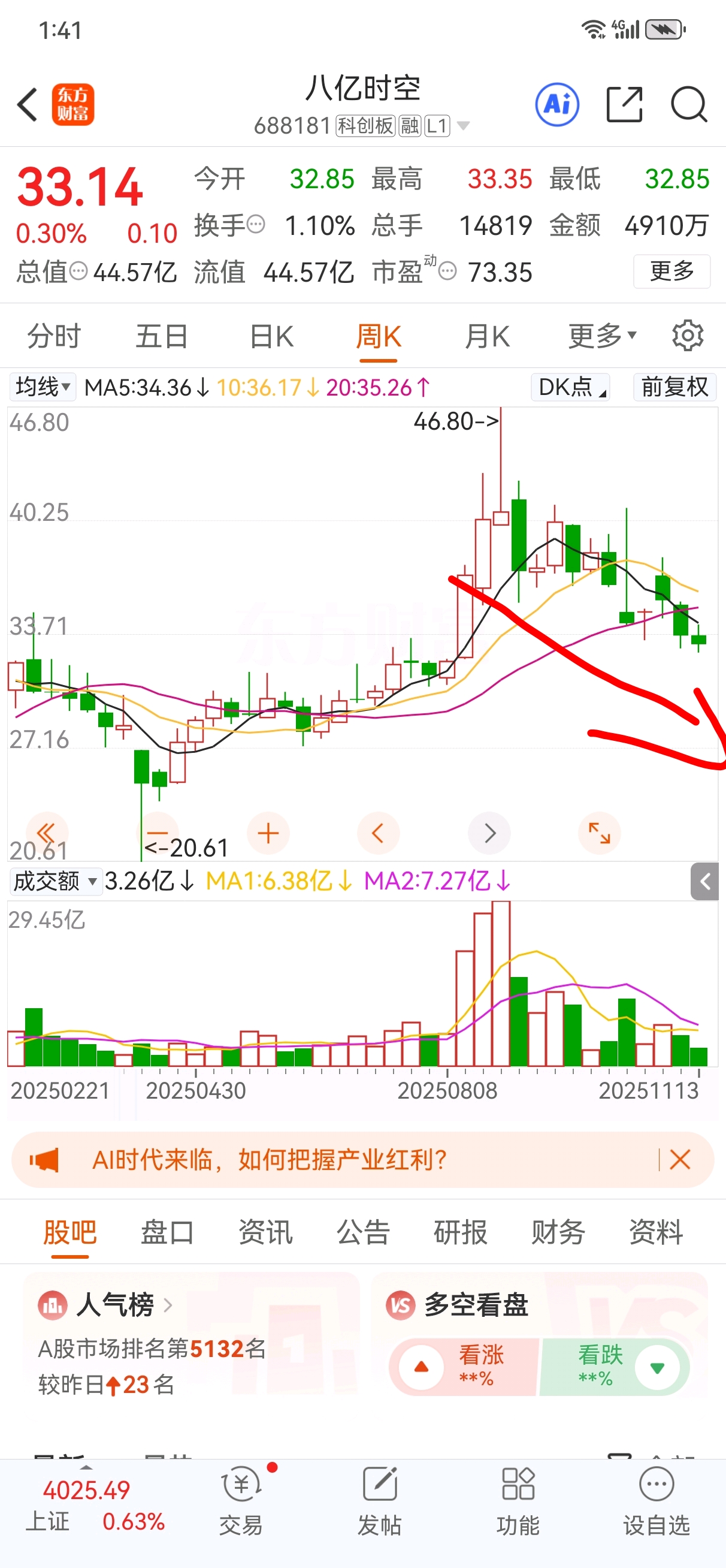 $八亿时空(SH688181)$ 最后300股也走了,没有1个月,难得调整过来,除非超级利好