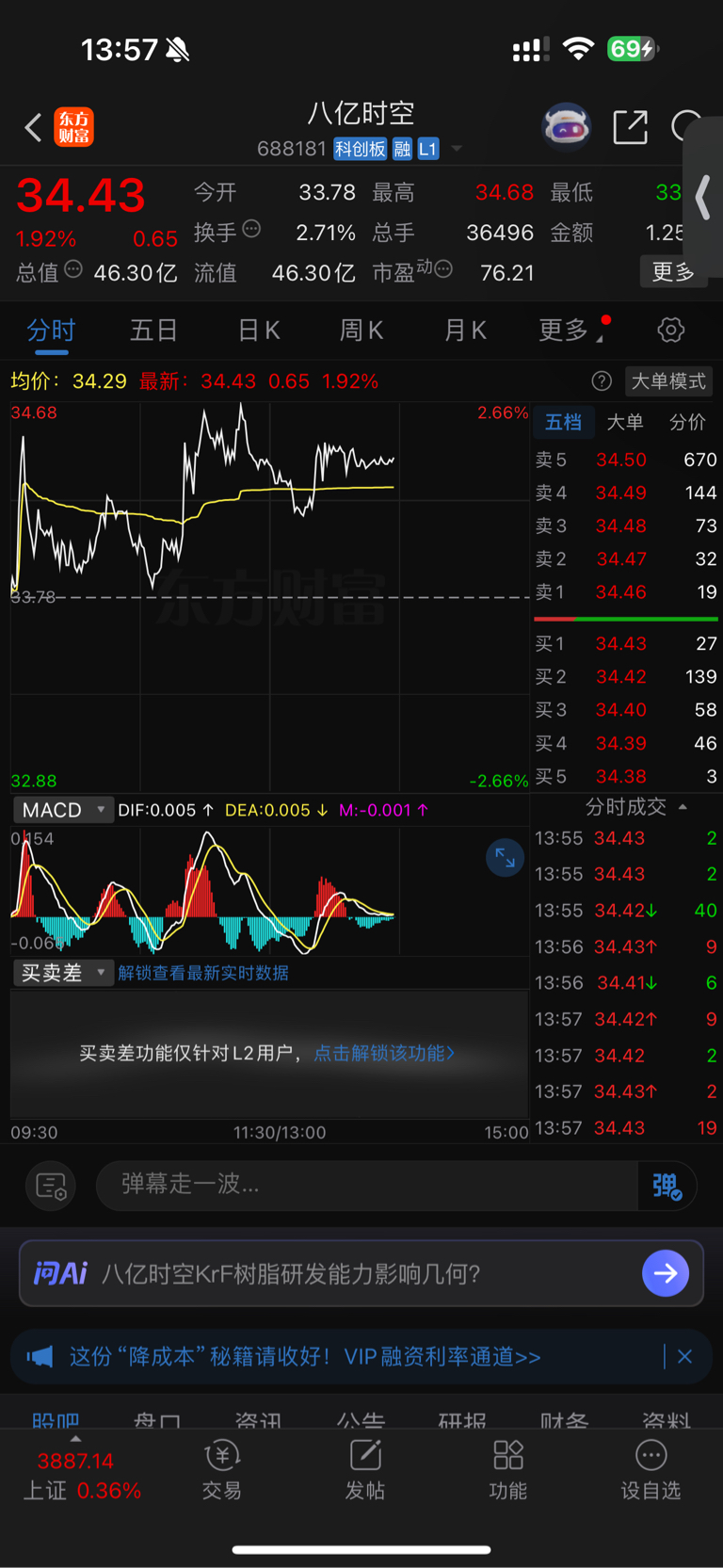 这股就是这样的,只要涨一丁点,上面就挂几百手卖,这个34.5的600手,一下午都