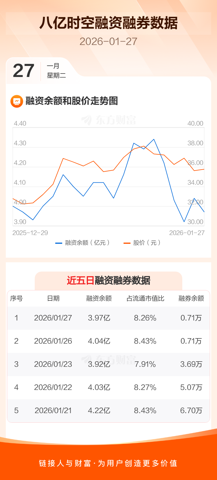 交易所最新数据显示,八亿时空于2026年1月27日获融资买入2031.41万元,融资偿还2662.75万元,当日融资净偿还631.35万元。目前,该股融资余额3.97亿,占流通市值比例为8.26%。