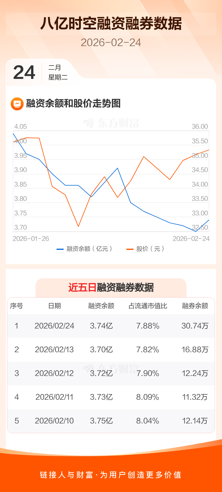 交易所最新数据显示,八亿时空于2026年2月24日获融资买入1984.05万元,融资偿还1552.40万元,当日融资净买入431.65万元。目前,该股融资余额3.74亿,占流通市值比例为7.88%。