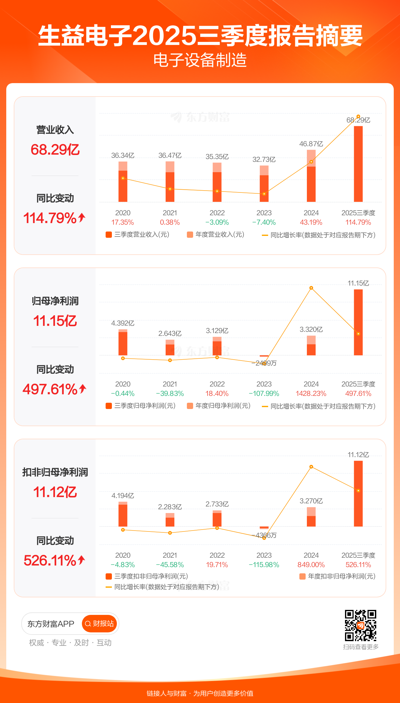 生益电子10月29日发布2025年三季报显示,公司前三季实现营业收入68.29亿元,同比增长114.79%;归母净利润11.15亿元,同比增长497.61%;扣非归母净利润11.12亿元,同比增长526.11%。
