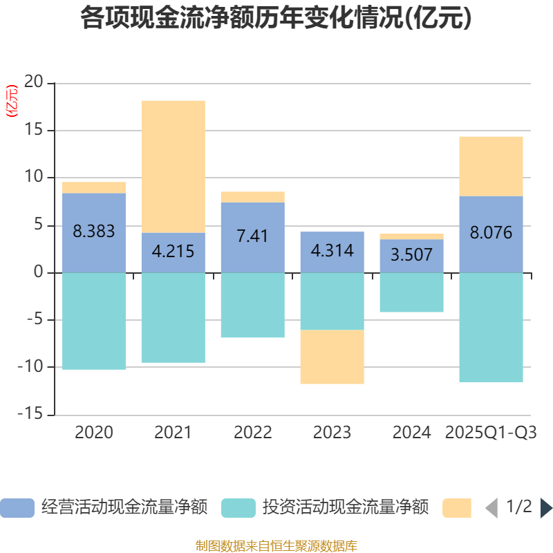 2025年前三季度,公司经营活动现金流净额为8.08亿元,同比增长144.17%;筹资活动现金流净额6.26亿元,同比增加6.83亿元;投资活动现金流净额-11.57亿元,上年同期为-3.22亿元。