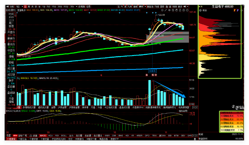 近两周递缩量调整,近半年换手最低1.1%~1.5%,昨日1.7%。套牢筹码约34