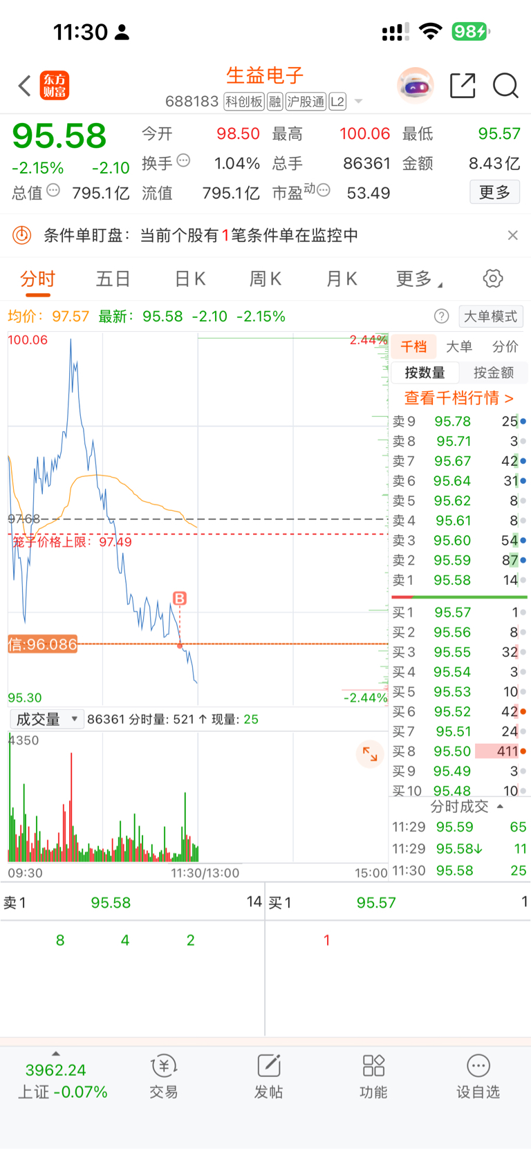 $生益电子(SH688183)$ 股价刚刚步入日线级别超卖区就急不可耐的买入了,其实下方支撑位是在94附近