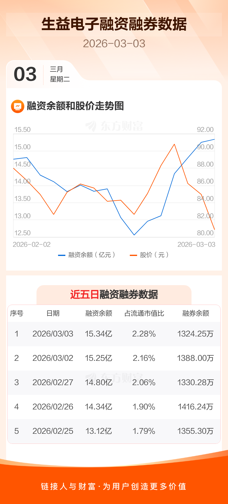 交易所最新数据显示,生益电子于2026年3月3日获融资买入1.75亿元,融资偿还1.66亿元,当日融资净买入902.24万元。目前,该股融资余额15.34亿,占流通市值比例为2.28%。