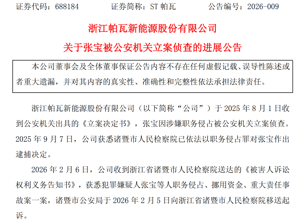 2025年8月1日,ST帕瓦收到公安机关出具的《立案决定书》,张宝因涉嫌职务侵占被公安机关立案侦查。2025年9月7日,ST帕瓦获悉诸暨市人民检察院已依法以职务侵占罪对张宝作出逮捕决定。