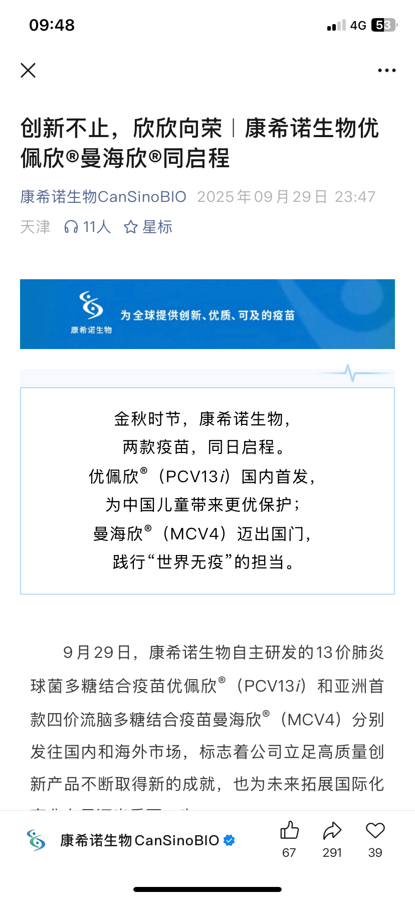$康希诺(SH688185)$ 13价肺炎国内发货,曼海欣国外发货。