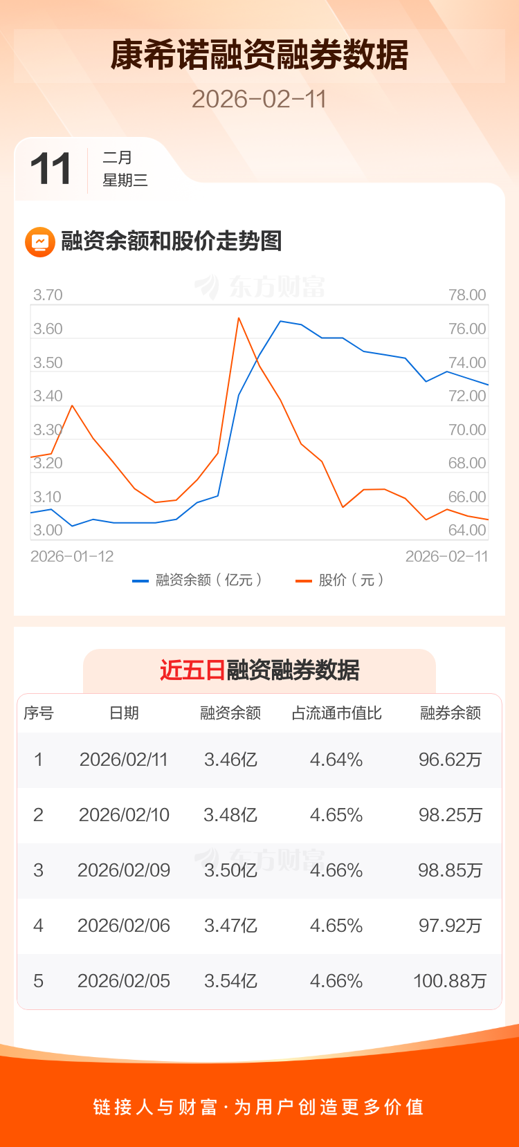 交易所最新数据显示,康希诺于2026年2月11日获融资买入564.76万元,融资偿还736.32万元,当日融资净偿还171.56万元。目前,该股融资余额3.46亿,占流通市值比例为4.64%。