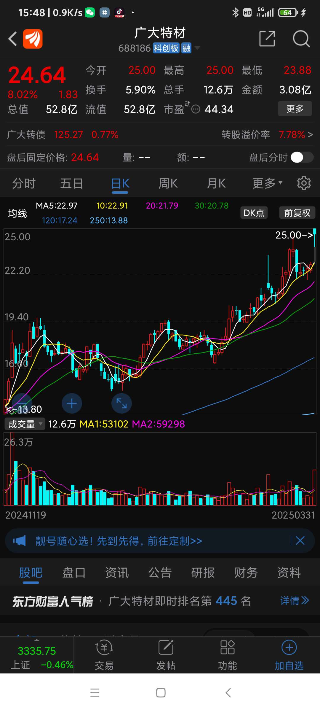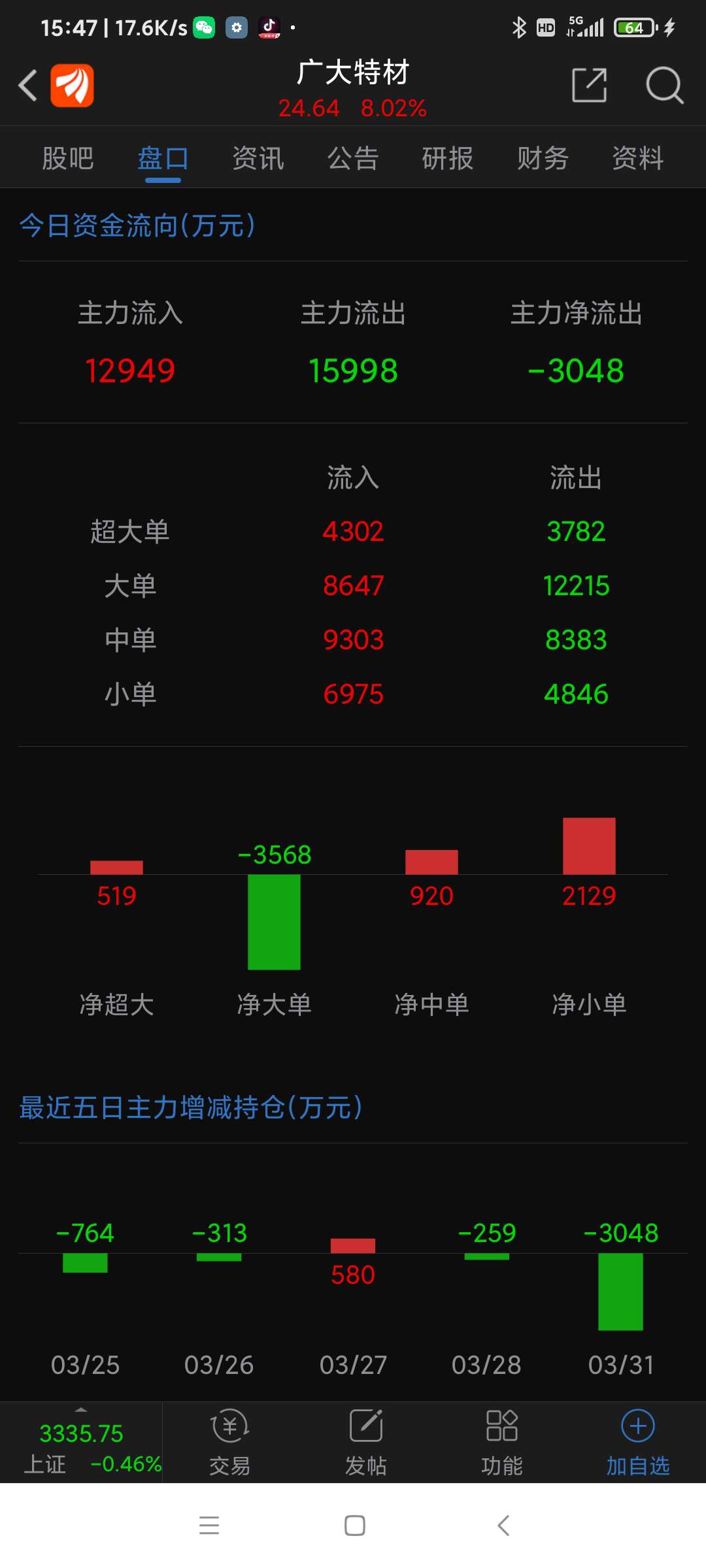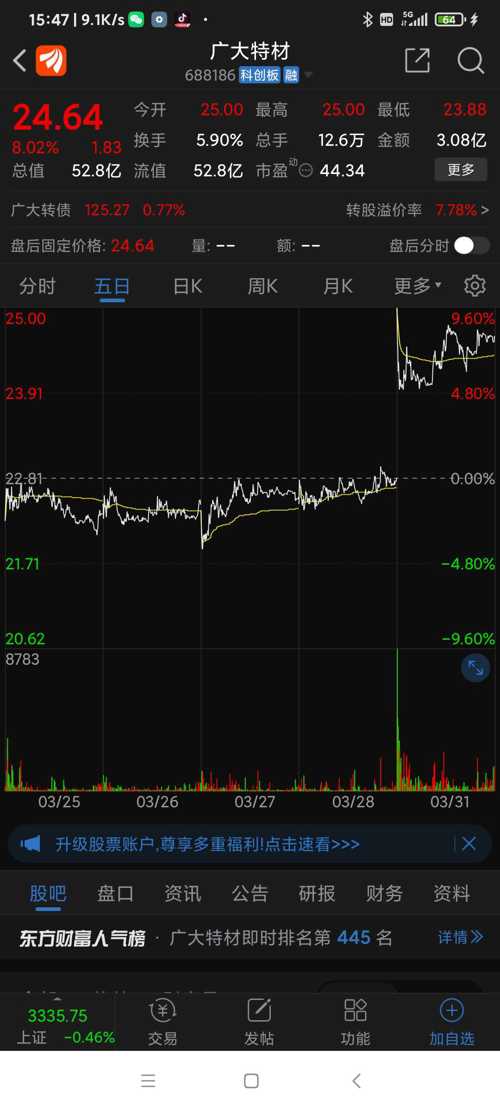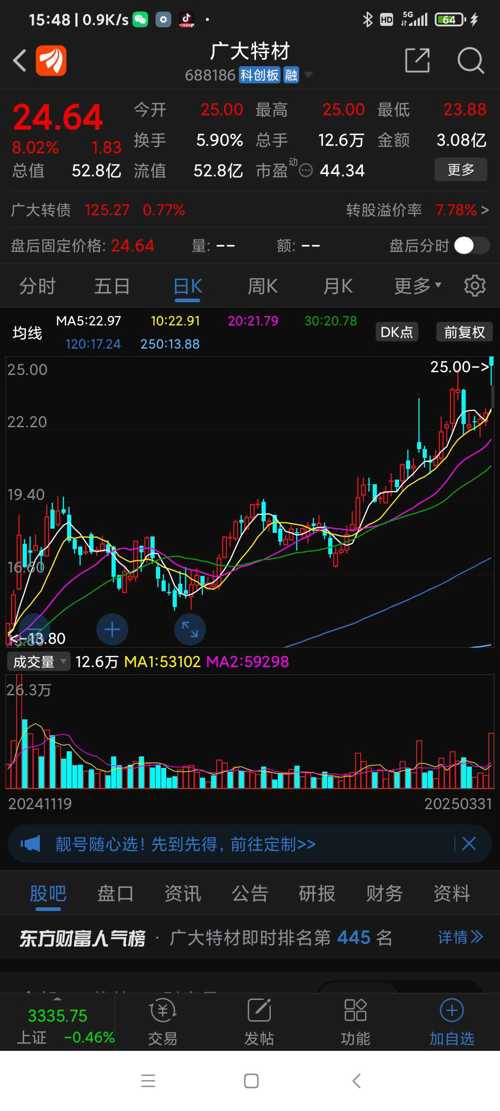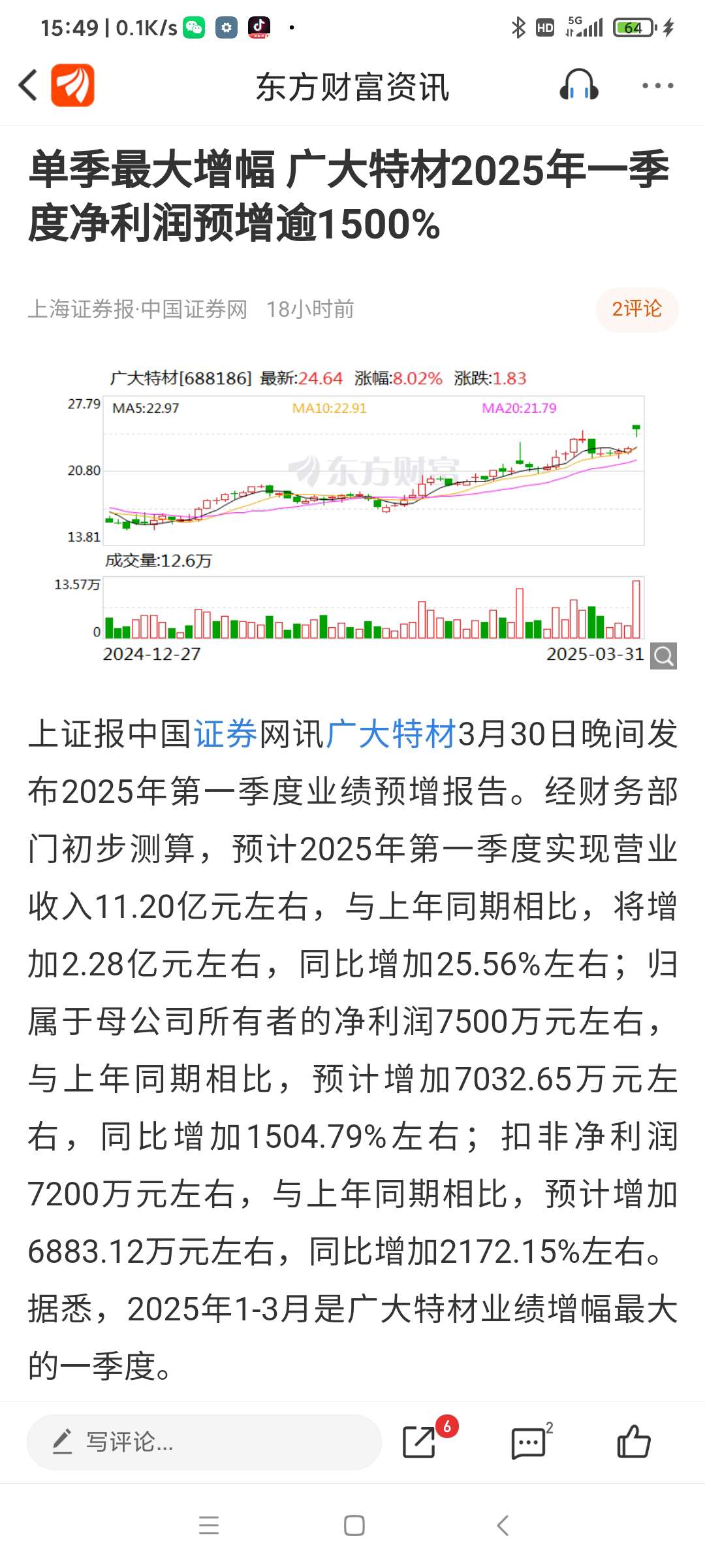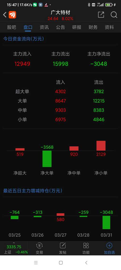 广大特材今日(250331一)走势,一季报预增,前有金雷股份,今有特材。