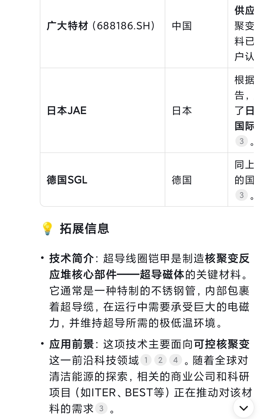 $广大特材(SH688186)$ ds了一下,超导线圈铠甲好像挺有技术含量的,全世界就3家能生产,广大是国内唯一一家。$合锻智能(SH603011)$ $上海电气(SH601727)$