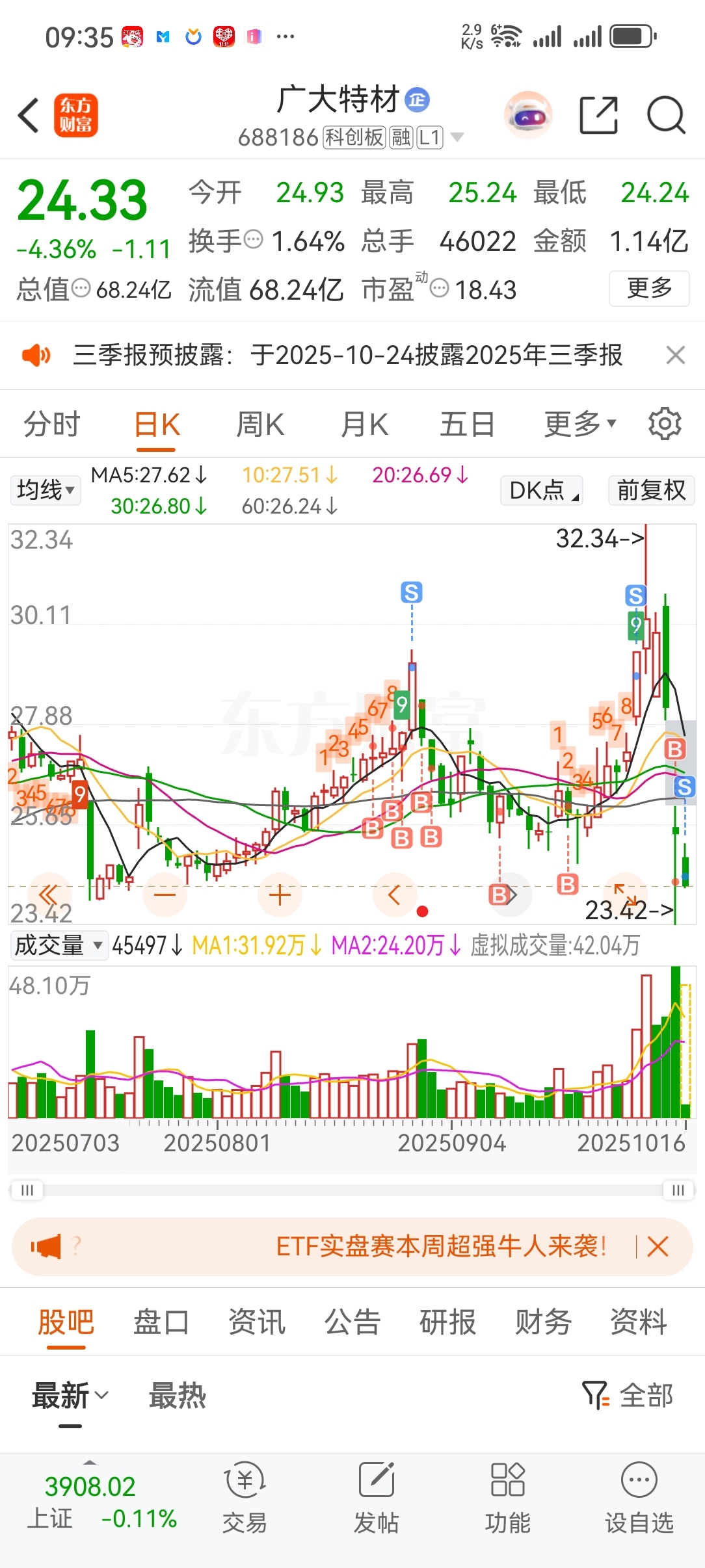 $广大特材(SH688186)$ 吓得一身冷汗。昨天24.39的成本,今天24.5跑了。居然还赚了91大元。
