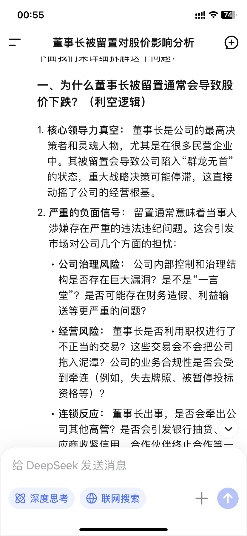 董事长留置意味着涉嫌严重的违纪违法行为,在没有公告澄清的情况下,雷的可能性会非常
