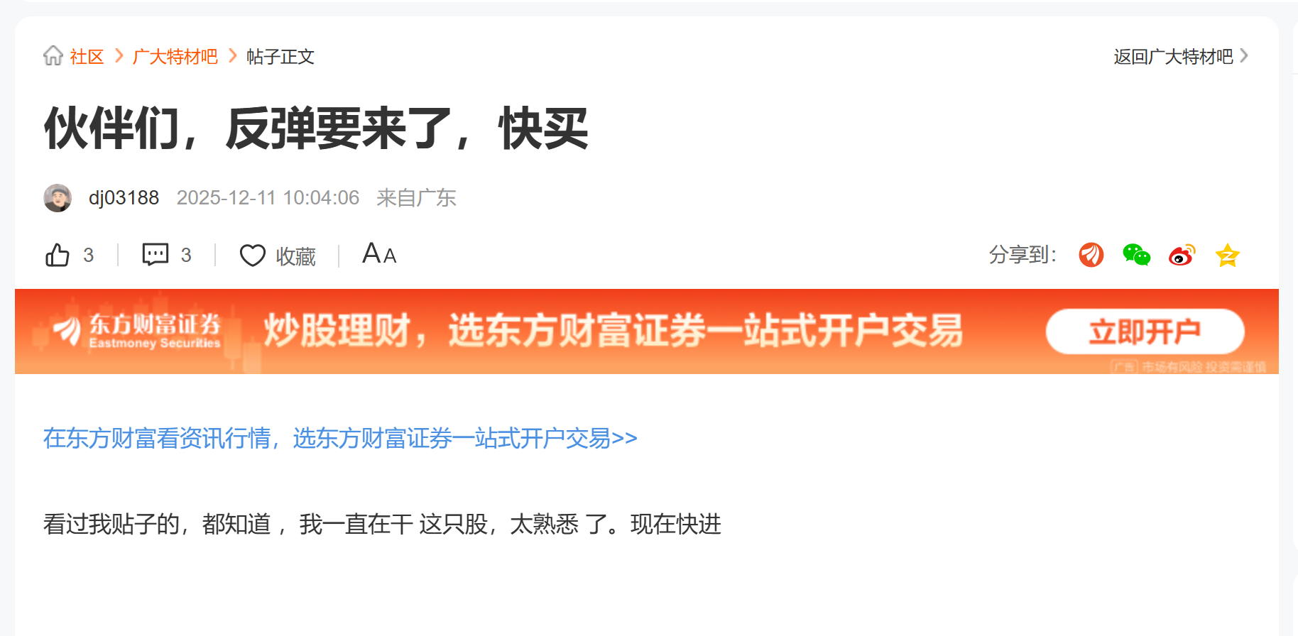 温馨提示: 1.根据《证券法》规定,禁止编造、传播虚假信息或者误导性信息,扰乱证券市场;2.用户在本社区发表的所有资料、言论等仅代表个人观点,与本网站立场无关,不对您构成任何投资建议。用户应基于自己的独立判断,自行决定证券投资并承担相应风险。《东方财富社区管理规定》