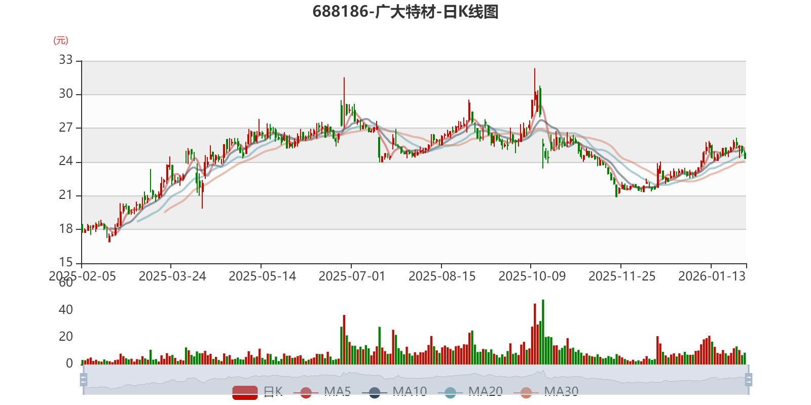 中证智能财讯广大特材(688186)1月29日晚间披露2025年度业绩预告,预计2025年实现营业收入49.2亿元,同比增长22.91%;归母净利润2.1亿元,同比增长82.61%;扣非净利润预计2亿元,同比增长170.27%。以1月29日收盘价计算,广大特材目前市盈率(TTM)约为32.47倍,市净率(LF)约1.43倍,市销率(TTM)约1.39倍。