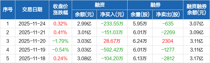 柏楚电子:融资净偿还233.55万元,融资余额2.99亿元(11-24)