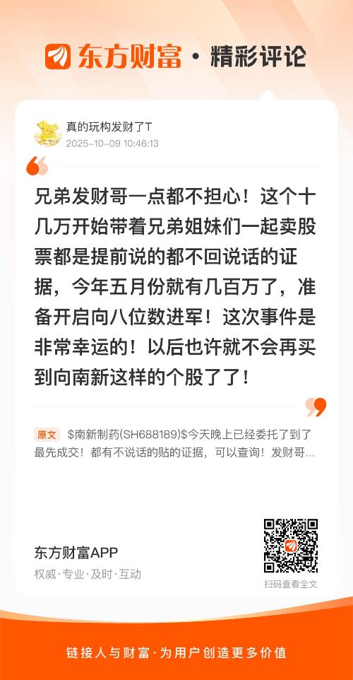 兄弟发财哥一点都不担心!这个十几万开始带着兄弟姐妹们一起卖股票都是提前说的都不回说话的证据,今年五月份就有几百万了,准备开启向八位数进军!这次事件是非常幸运的!以后也许就不会再买到向南新这样的个股了了!