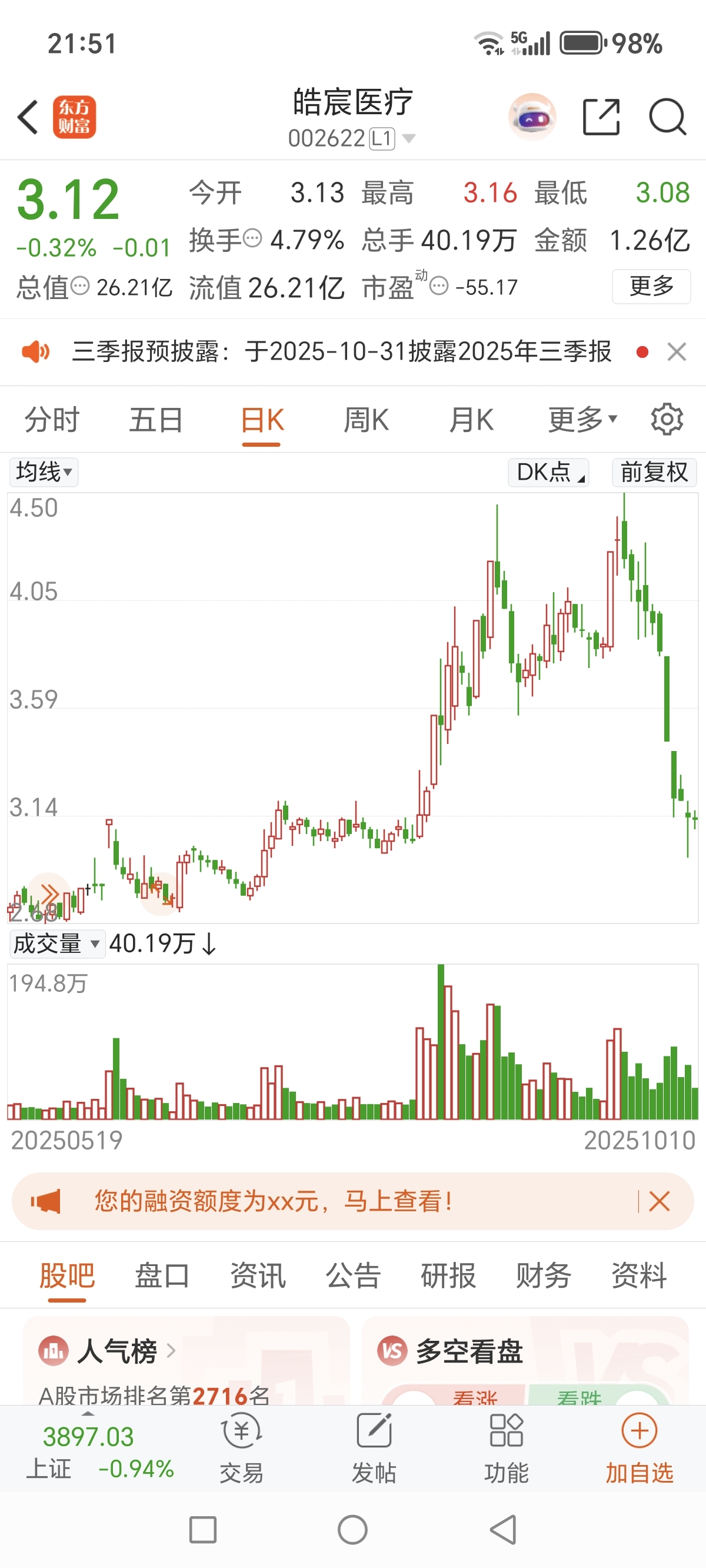 $南新制药(SH688189)$ $皓宸医疗(SZ002622)$ $上证指数(SH000001)$ 我朋友在4.30元全仓进的皓宸医疗,他说他现在痛不欲生