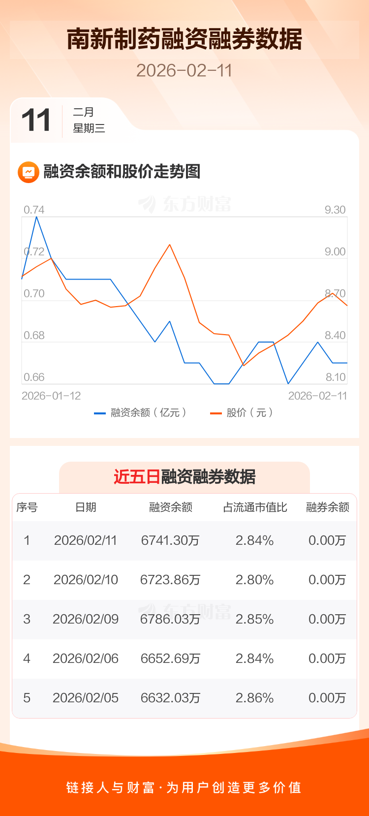 交易所最新数据显示,南新制药于2026年2月11日获融资买入359.60万元,融资偿还342.16万元,当日融资净买入17.44万元。目前,该股融资余额6741.30万,占流通市值比例为2.84%。
