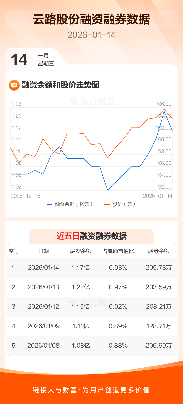 交易所最新数据显示,云路股份于2026年1月14日获融资买入1598.94万元,融资偿还2166.54万元,当日融资净偿还567.61万元。目前,该股融资余额1.17亿,占流通市值比例为0.93%。