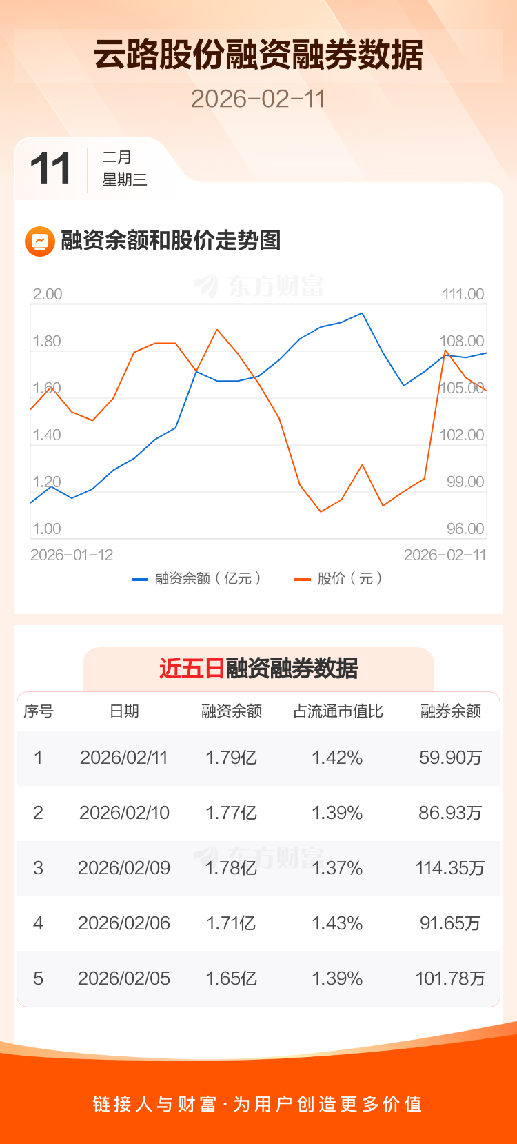 交易所最新数据显示,云路股份于2026年2月11日获融资买入1647.45万元,融资偿还1401.76万元,当日融资净买入245.69万元。目前,该股融资余额1.79亿,占流通市值比例为1.42%。