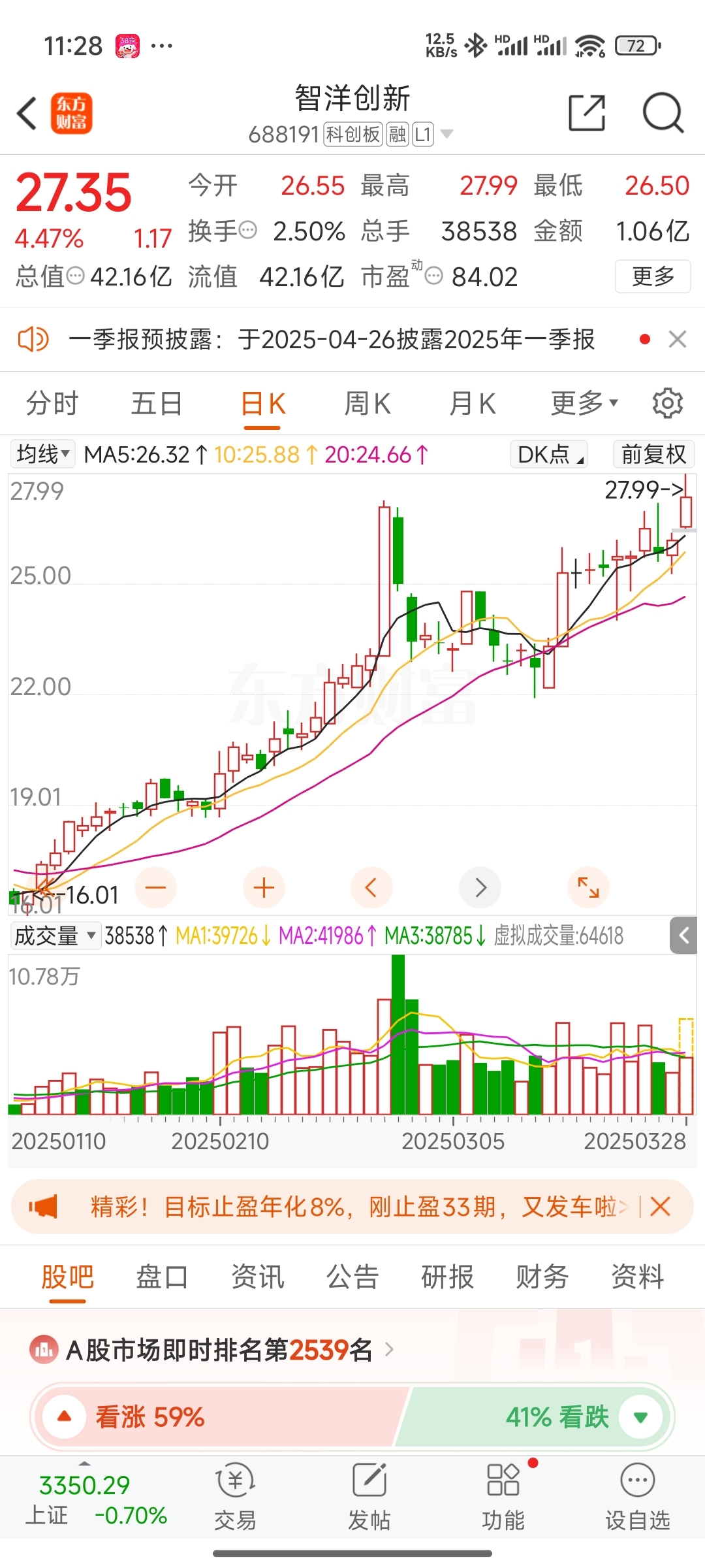 $智洋创新(SH688191)$ 温和放量突破前高,去找新高了,关注关注,先看34