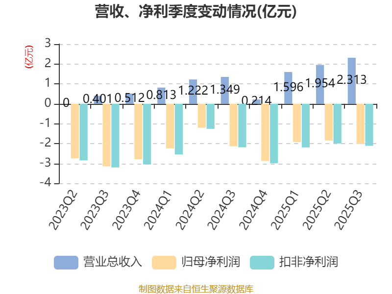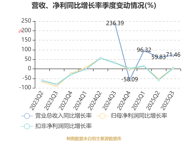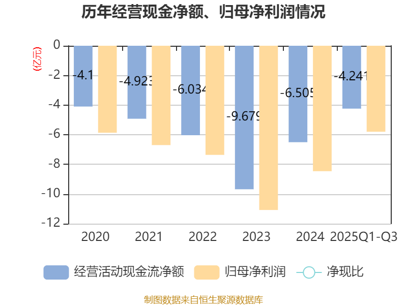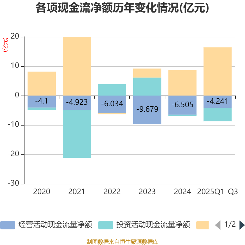 2025年前三季度,公司经营活动现金流净额为-4.24亿元,同比增加3925.15万元;筹资活动现金流净额16.41亿元,同比增加10.34亿元;投资活动现金流净额-4.52亿元,上年同期为-8661.67万元。