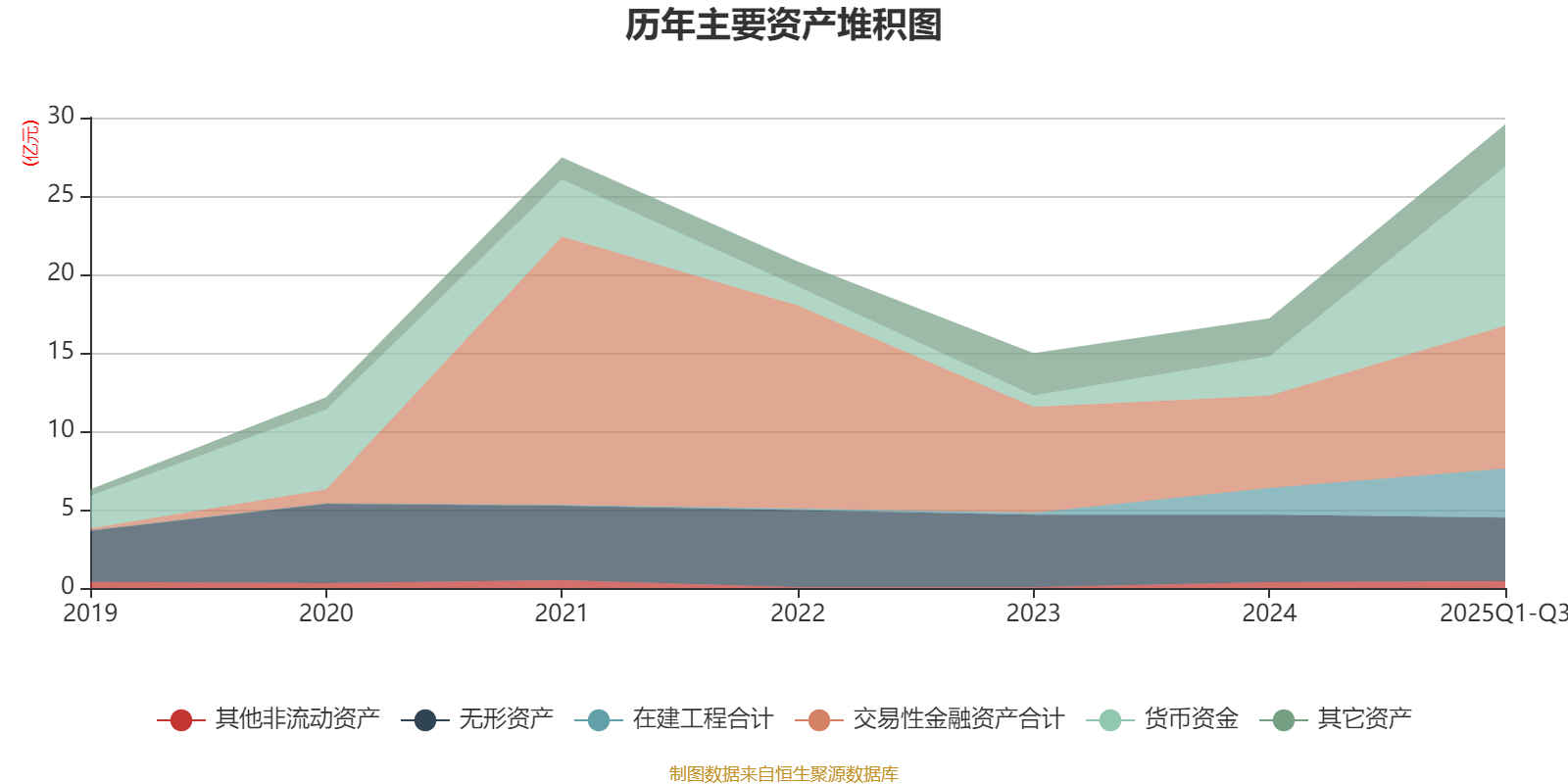 资产重大变化方面,截至2025年三季度末,公司货币资金较上年末增加305.64%,占公司总资产比重上升19.78个百分点;无形资产较上年末减少5.85%,占公司总资产比重下降11.32个百分点;交易性金融资产合计较上年末增加54.54%,占公司总资产比重下降3.47个百分点;应收票据及应收账款较上年末增加362.28%,占公司总资产比重上升2.7个百分点。