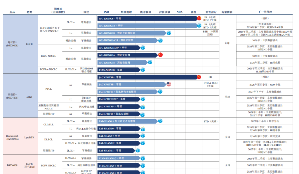 除了上述两款已商业化产品,迪哲医药还有一款处于注册性临床阶段的候选药物、三款处于概念验证后阶段的资产和一款处于早期临床阶段的资产。其中Birelentinib (DZD8586)是一种创新的淋巴细胞特异性蛋白酪氨酸激酶和布鲁顿酪氨酸激酶双重抑制剂,是目前首个及唯一处于临床开发阶段的Lyn/BTK双重抑制剂。该药物已于2025年8月获得美国FDA快速通道资格认定,迪哲医药还于2025年9月启动其治疗复发/难治性CLL/SLL的国际多中心三期临床试验。