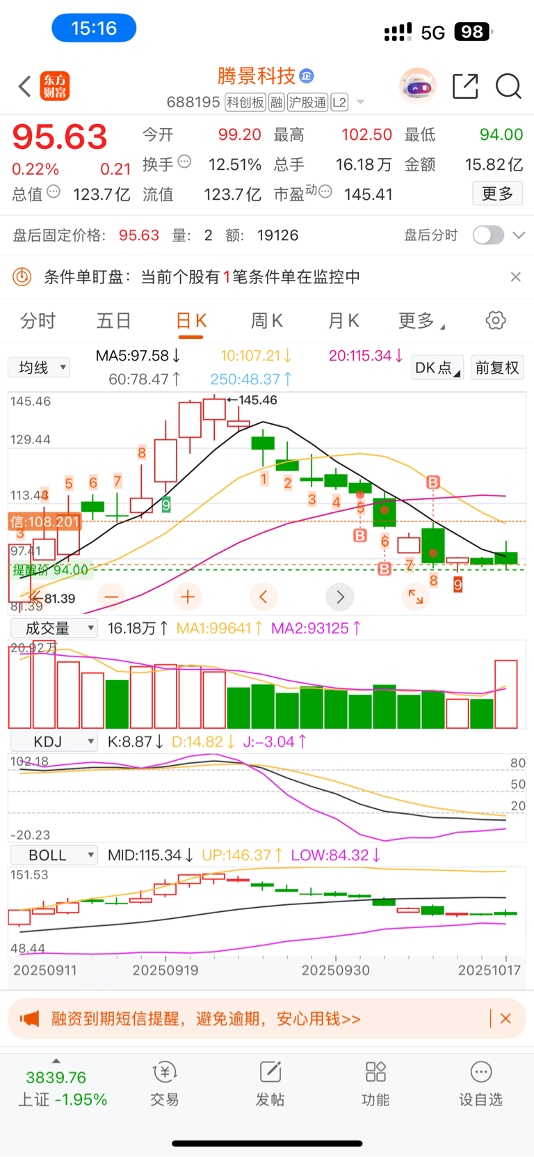 $腾景科技(SH688195)$ 这周末连吃两天面终于被我悟出来啦,94就是本次回调底部,原本以为要80附近止跌留着仓位等待补仓,结果周五已经开始放量,那就等着回本吃肉吧