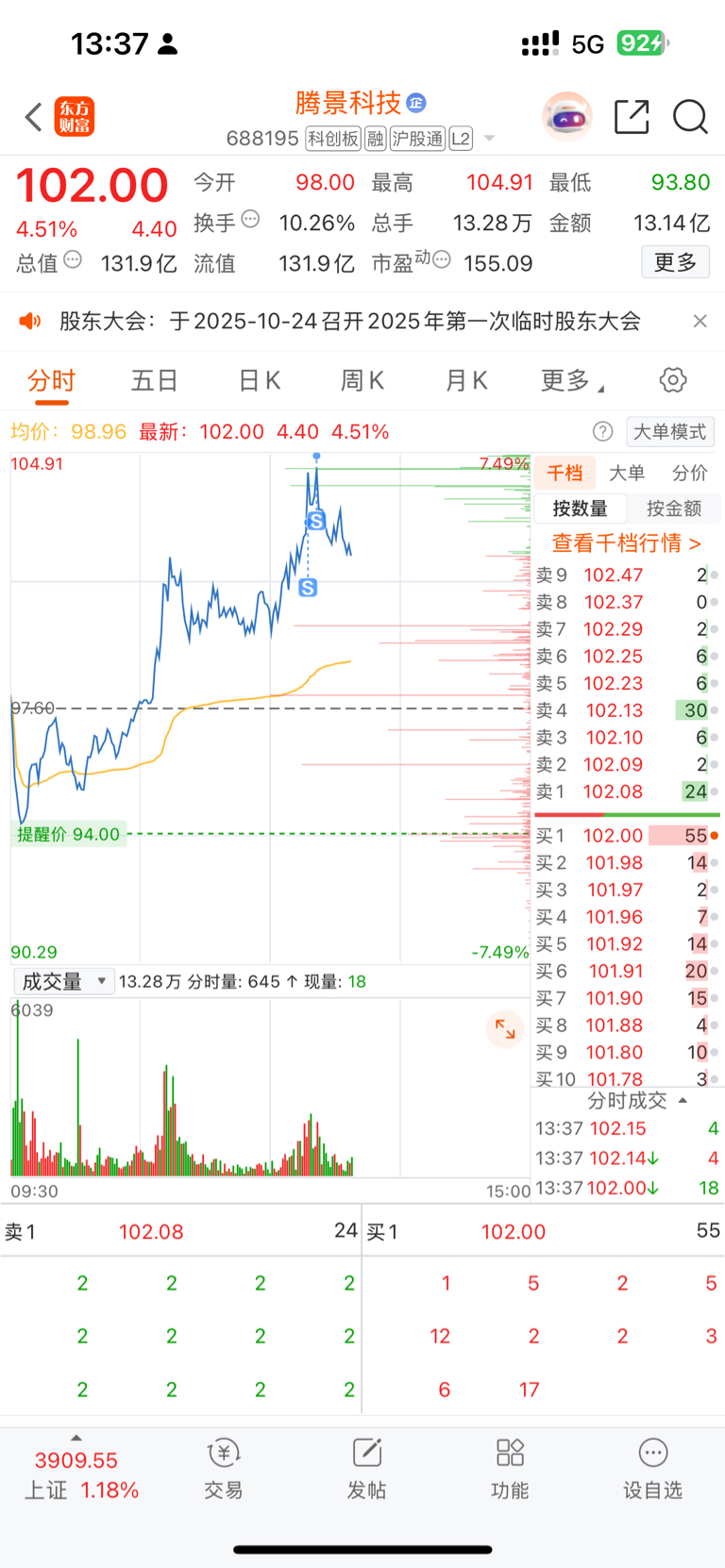 $腾景科技(SH688195)$ 反弹而已,明天95下方加仓