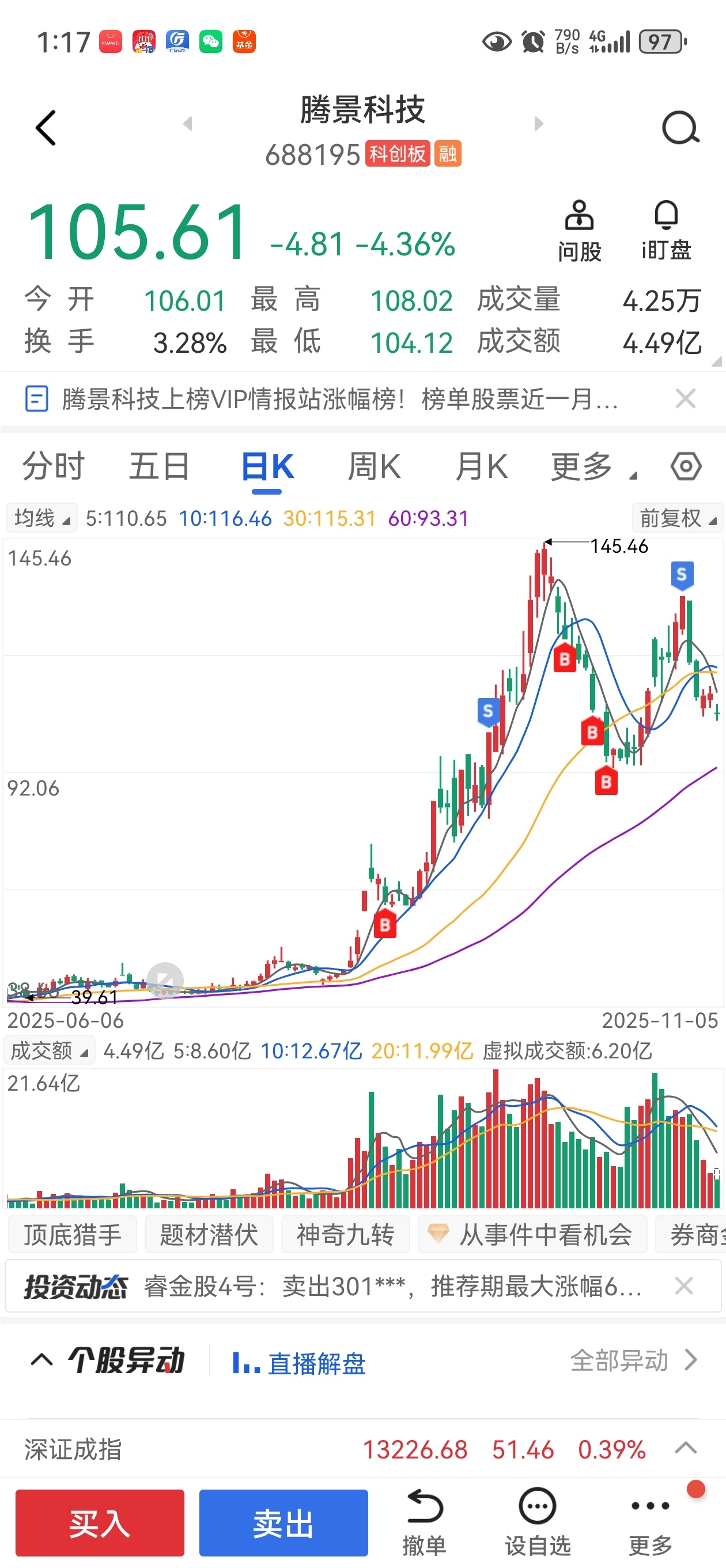 $腾景科技(SH688195)$ 要回到100以内啰,记得那天走时叫大家保住利润,还一堆人笑我呢