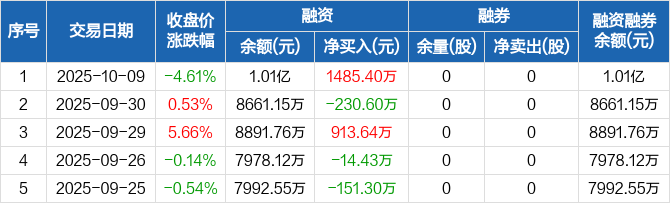 卓越新能:融资净买入1485.4万元,融资余额1.01亿元(10-09)