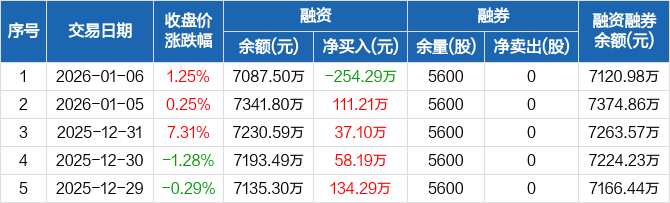 卓越新能:融资净偿还254.29万元,融资余额7087.5万元(01-06)