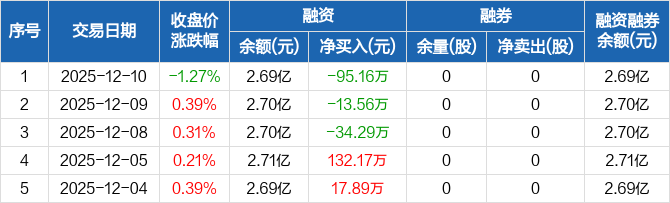 融资方面,当日融资买入147.57万元,融资偿还242.73万元,融资净偿还95.16万元,连续3日净偿还累计143.01万元。融券方面,融券卖出0股,融券偿还0股,融券余量0股,融券余额0元。融资融券余额合计2.69亿元。
