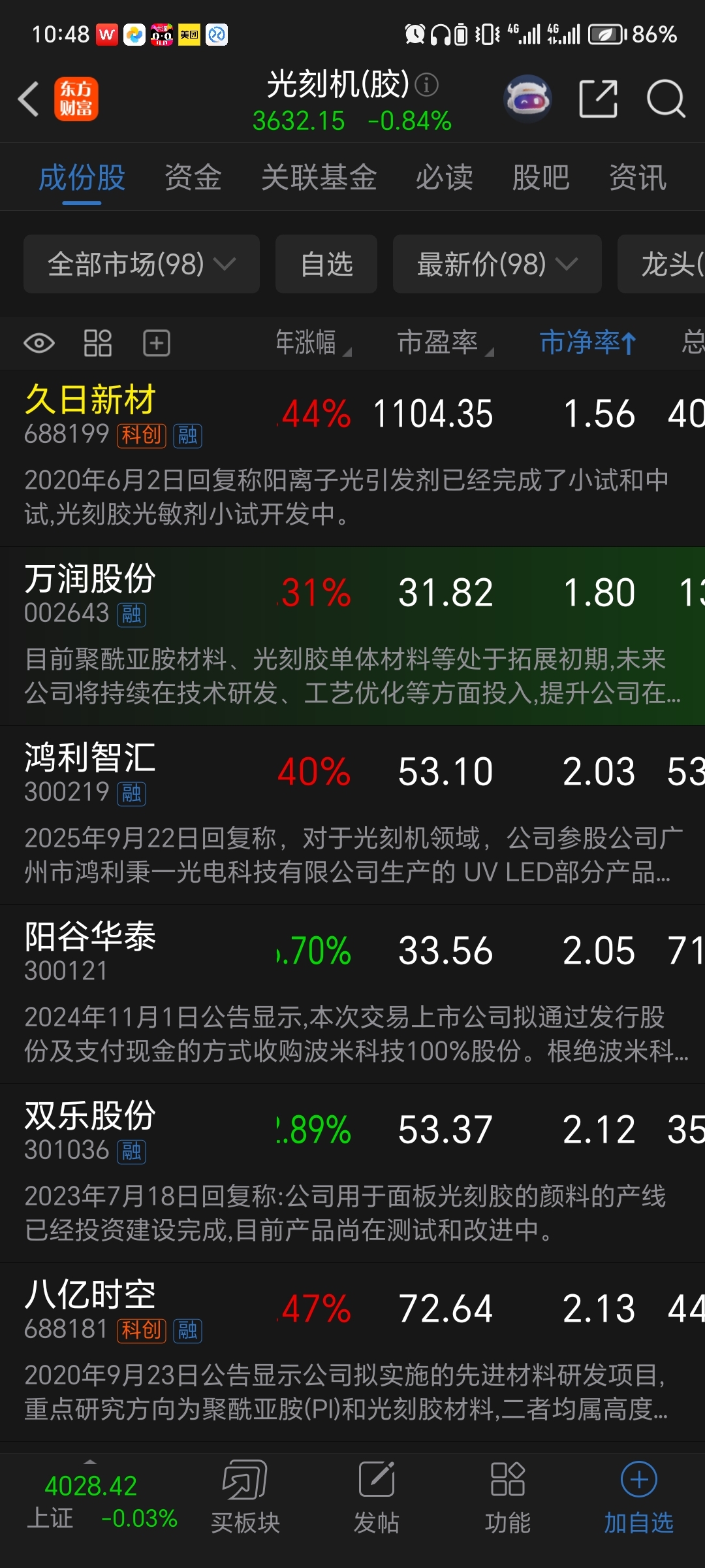 $久日新材(SH688199)$ 已经在光刻胶板块里边估值最低了,你还想往哪跌啊?正常都在两倍市净率附近!