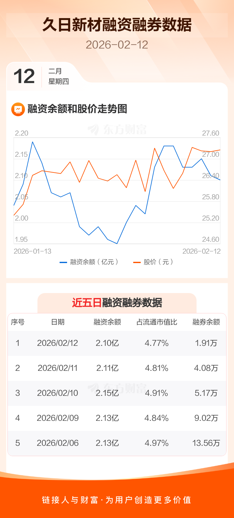 交易所最新数据显示,久日新材于2026年2月12日获融资买入684.10万元,融资偿还824.66万元,当日融资净偿还140.56万元。目前,该股融资余额2.10亿,占流通市值比例为4.77%。