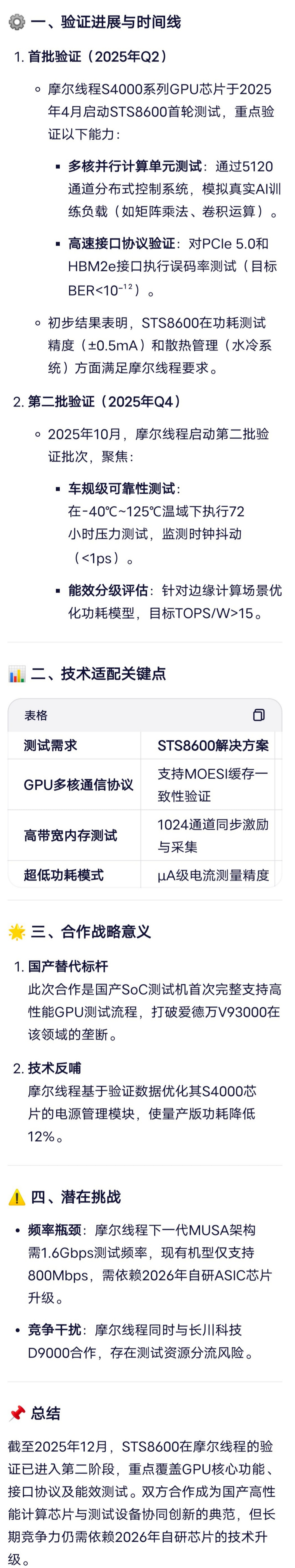 这是Ai的回答sts8600在摩尔线程的验证进展