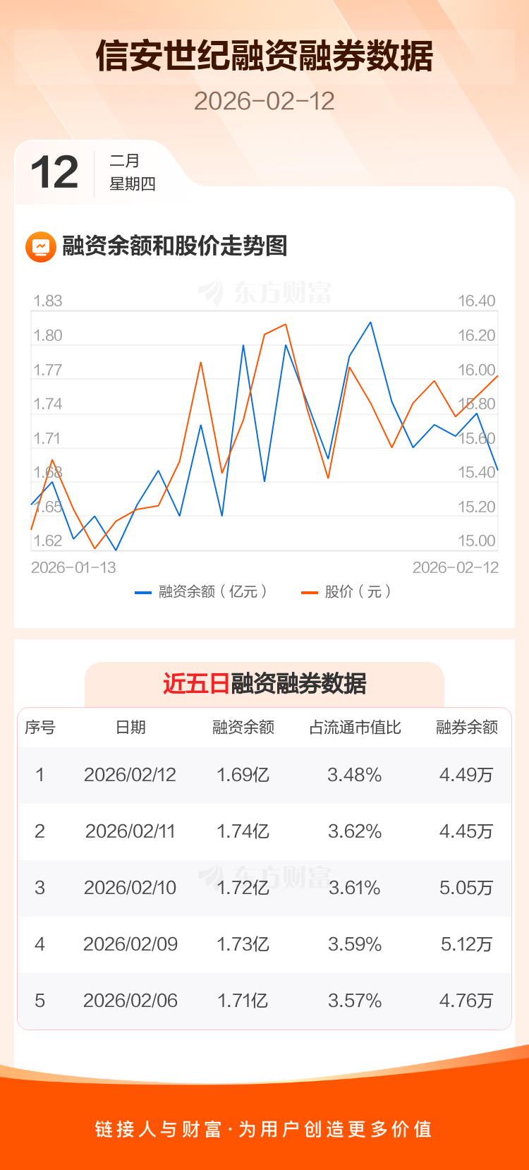 交易所最新数据显示,信安世纪于2026年2月12日获融资买入943.33万元,融资偿还1499.08万元,当日融资净偿还555.75万元。目前,该股融资余额1.69亿,占流通市值比例为3.48%。